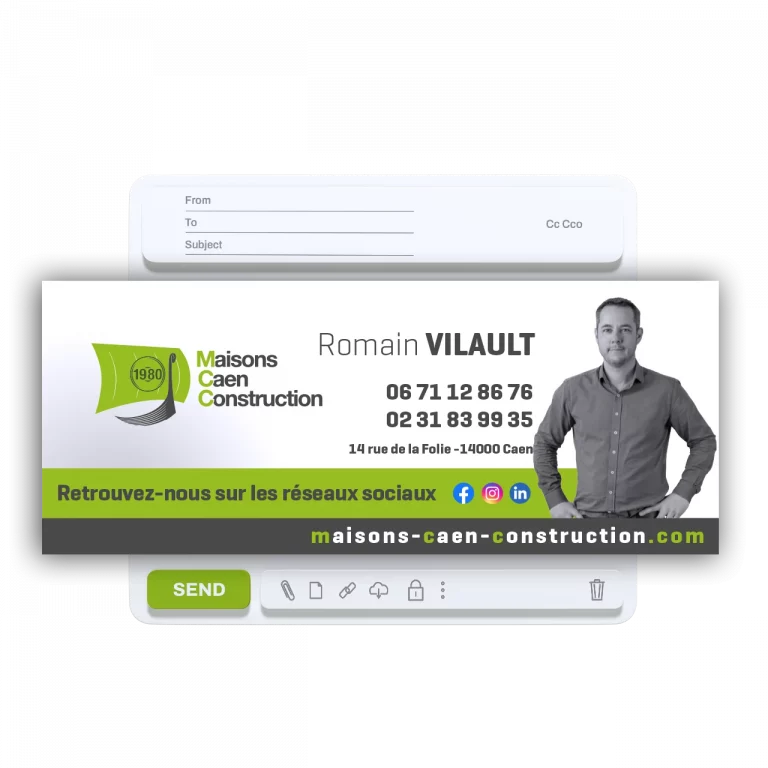 Un email, c’est souvent le premier échange avec un prospect. Pour Maisons Caen Construction, nous avons mis en place des signatures de mail uniformisées :